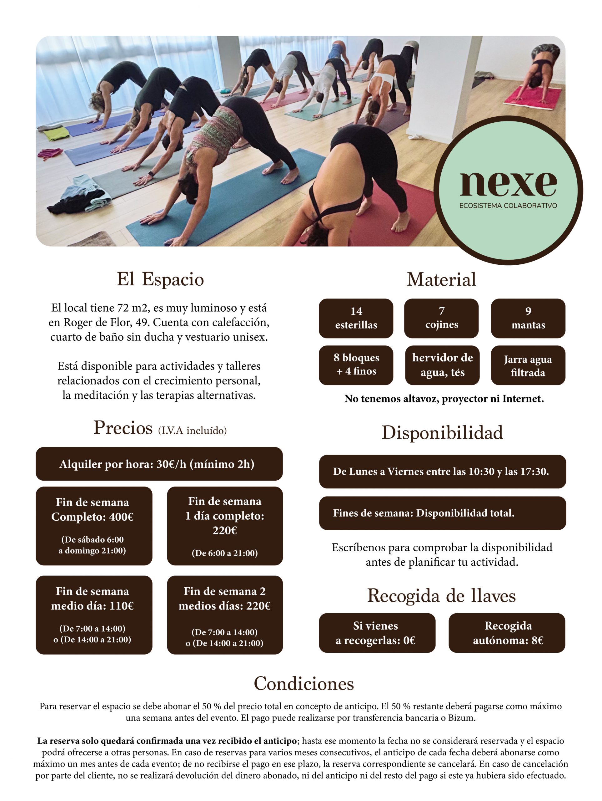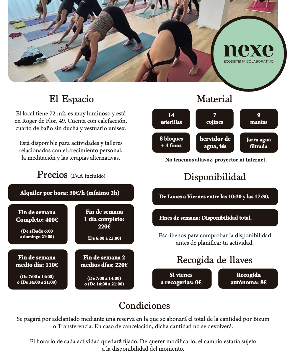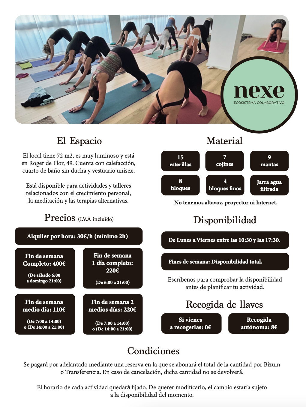 Si estás interesadx y quieres recibir información más detallada o venir a visitarnos para conocer el espacio, escríbenos un email a nexebcn@gmail.com